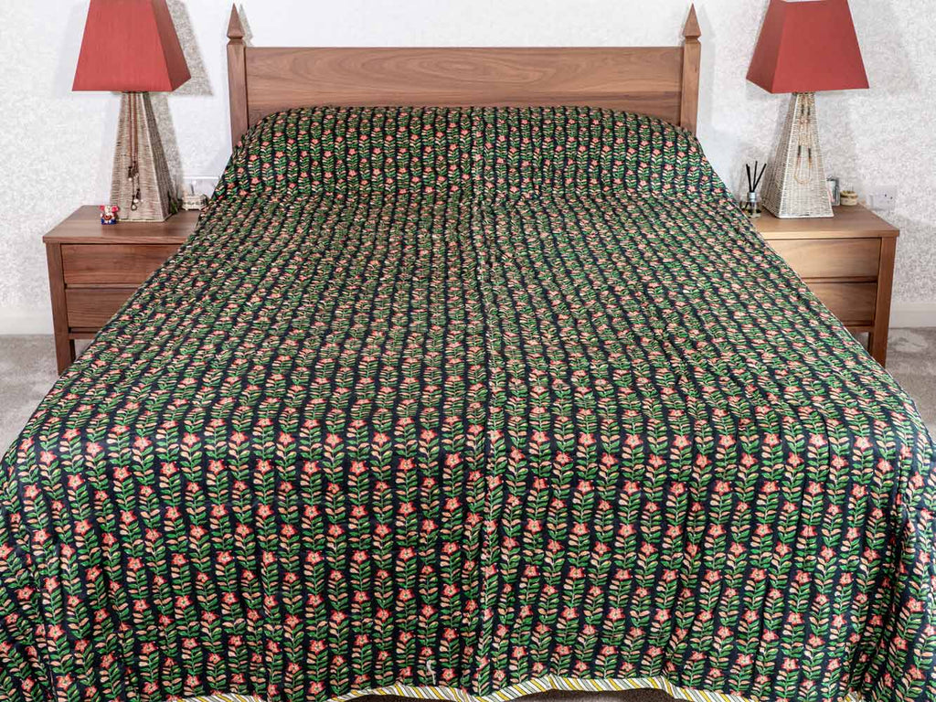 The reverse side has the same print with a black background so you get two quilts in one! A delightfully comfortable Indian quilt, made from soft lightweight cotton with a quilted cotton filling.