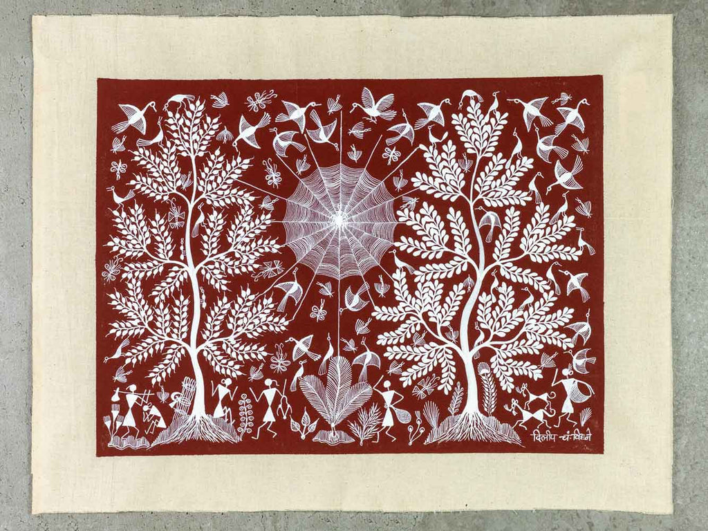 A burnt umber background contains vivid scenes of a spider's web attached to two elegant trees occupied by birds & insects. Under the trees, at ground level, villagers are going about their daily life carrying baskets and other implements. In the middle of it all sits the spider at the centre of the web.