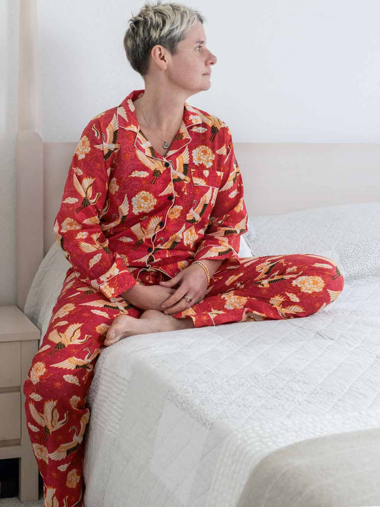 Fine Indian cotton pyjamas with a stunning print of elegant golden cranes on a red background.