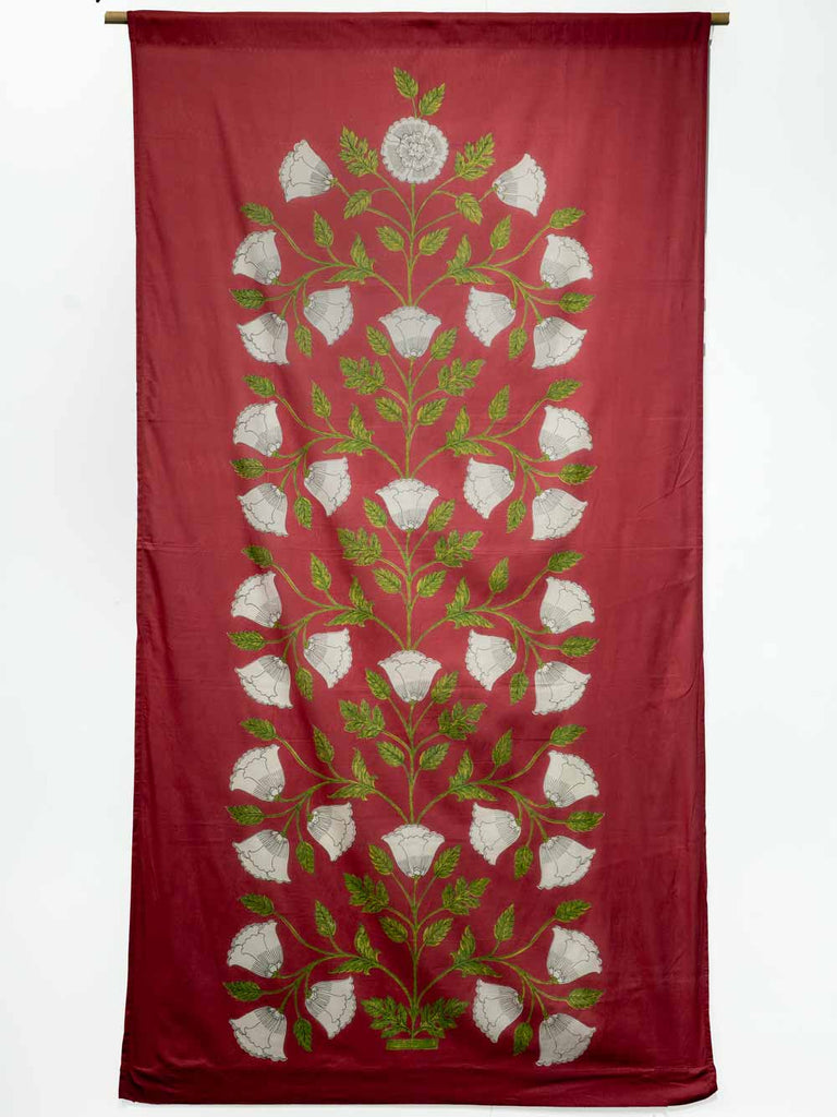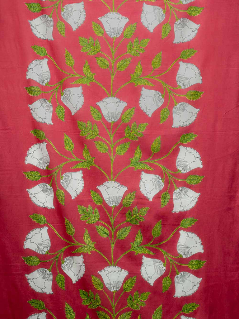 A cotton voile curtain with printed white flowers and green leaves on a red background.