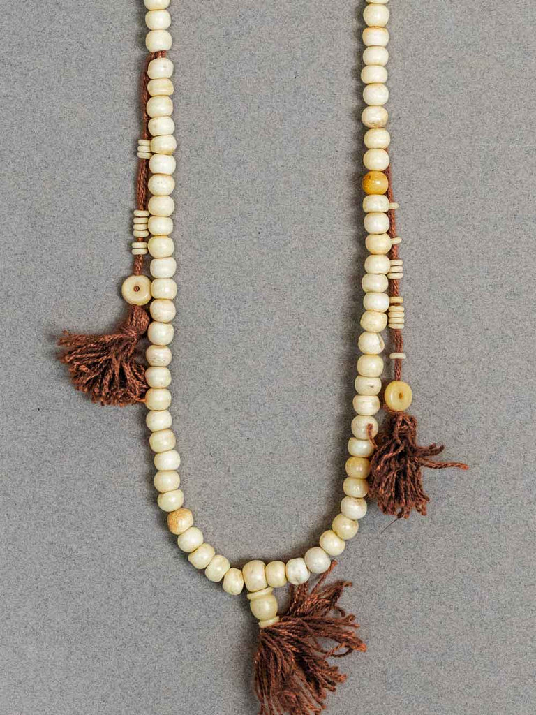 Pale camel bone Tibetan mala prayer beads with terracotta red tassels.